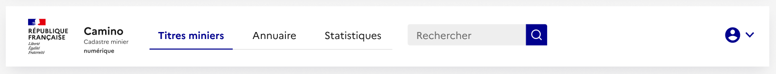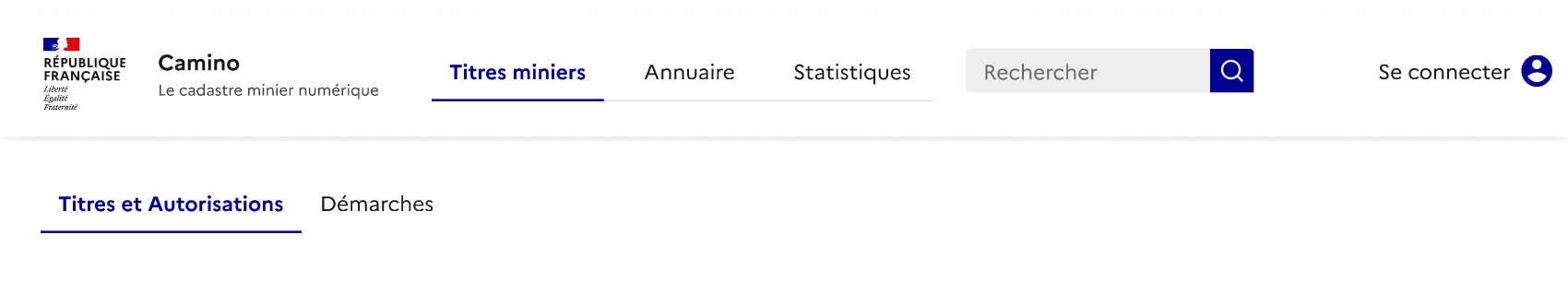 /!\ Comportement de la Search bar quand on réduit la tailel de l'écran /!\ Si on trouve que l'on manque de place dans le header -> Possibilité de gagner de l'espace sur le "logo" Camino (passer le cadastre minier ouvert sur 2 lignes) : exemple